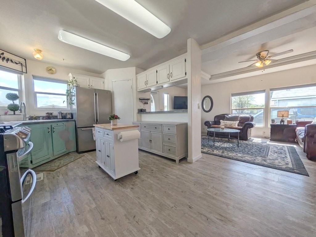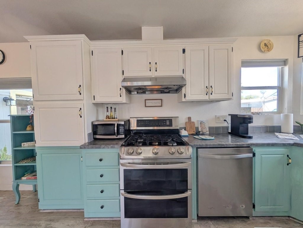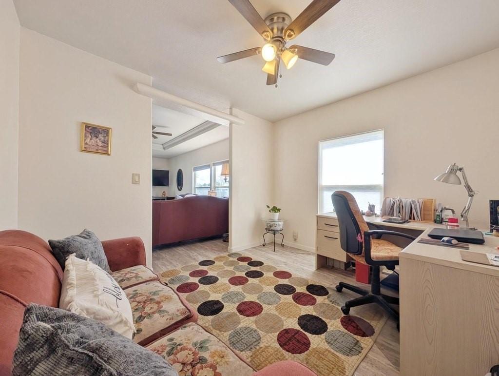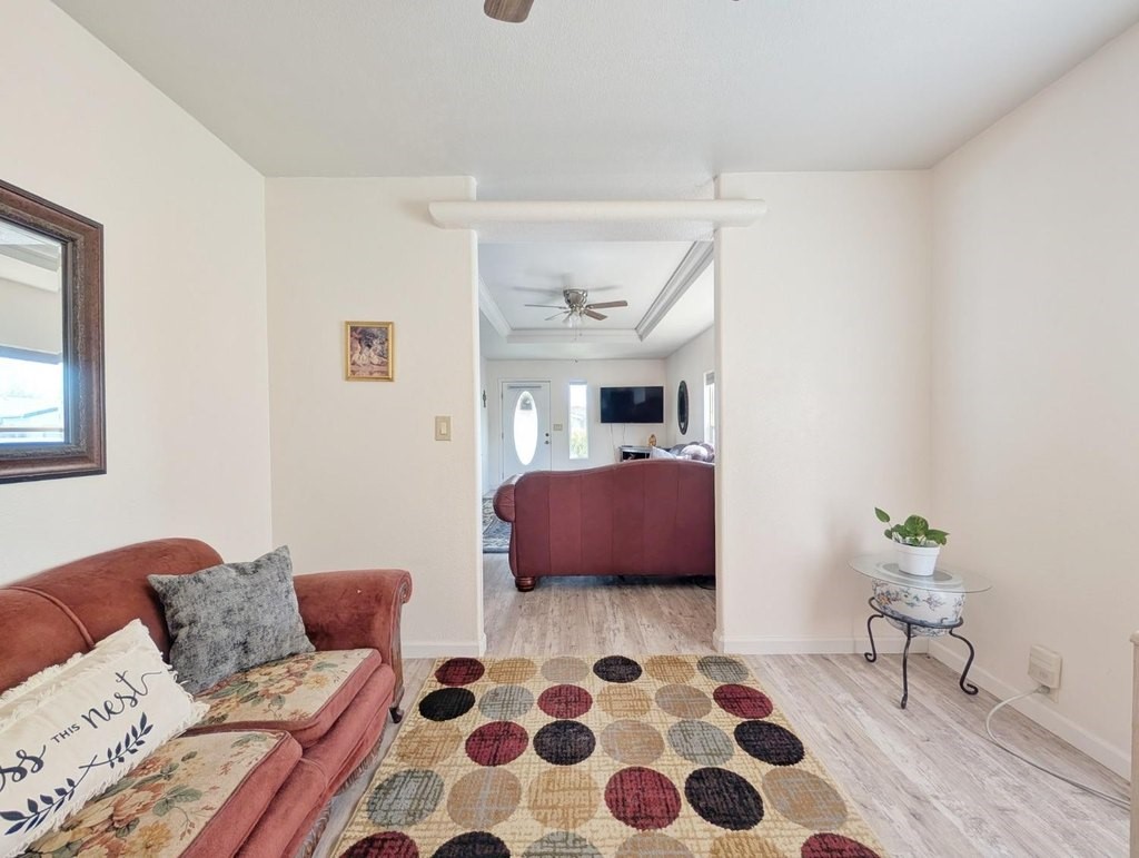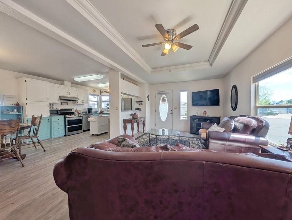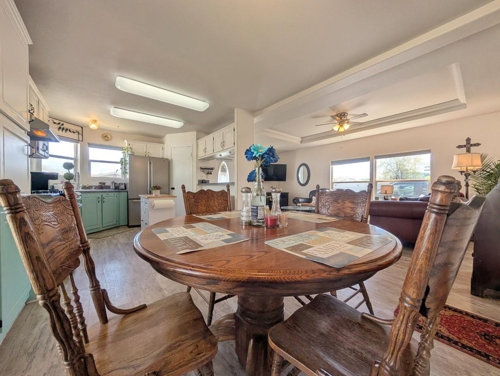Located at the end of a cul-de-sac in The Oaks, a beautiful, gated community where you OWN your land and Traditional Financing is Available! This 2-bed +Den (optional 3rd bedroom), 2-bath home features a new roof, gutters, and front door awning (2024). Inside, enjoy new luxury vinyl flooring throughout, tray ceiling with crown molding in the living room, and an Ecobee thermostat for energy efficiency. The kitchen offers an abundance of two-tone cabinetry, new valance lighting, a shelved pantry, stainless steel appliances, 6-burner gas stove, with the refrigerator, island, and buffet table to convey. The primary bath includes a dual vanity, large soaking tub, and separate shower, laundry/mud room features cabinetry/shelving and space for an upright fridge/freezer. The fully fenced backyard has auto-timed drip irrigation, a canvas-covered gazebo, and a side yard with stepping-stones. A great space for entertaining! The two-car garage includes an opener, workbench, with plenty of storage options. Central heat & air and park-owned solar for lower utility costs (10.6/KW for the first 7, 500 annual hours). Community amenities include a pool, rec room, playground, stocked fishpond and optional RV/boat parking. Come see for yourself and Love where you Live!